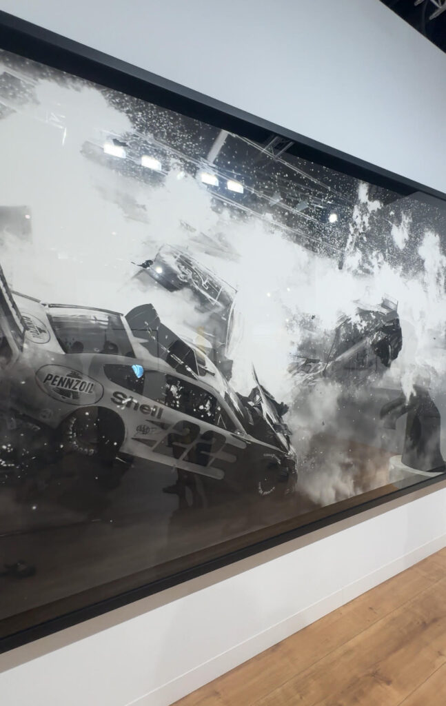 Outro nome marcante foi o do artista americano Robert Longo, natural do Brooklyn e amplamente reconhecido por sua abordagem multidisciplinar. Com um histórico que atravessa fotografia, desenho e até música, Longo investiga as interseções entre tecnologia, mídia, política e experiência humana. Em obras monumentais como Untitled (Nascar Crash, Daytona) (2021) e Untitled (Daytona Crash) (2025), ele recria cenas de colisões de alta velocidade em carvão, transformando acidentes reais em arquétipos contemporâneos de poder, destruição e espetáculo social. Uma de suas peças, inclusive, faz referência a um acidente envolvendo um ex-colega de classe, reforçando o caráter pessoal e histórico de sua pesquisa.