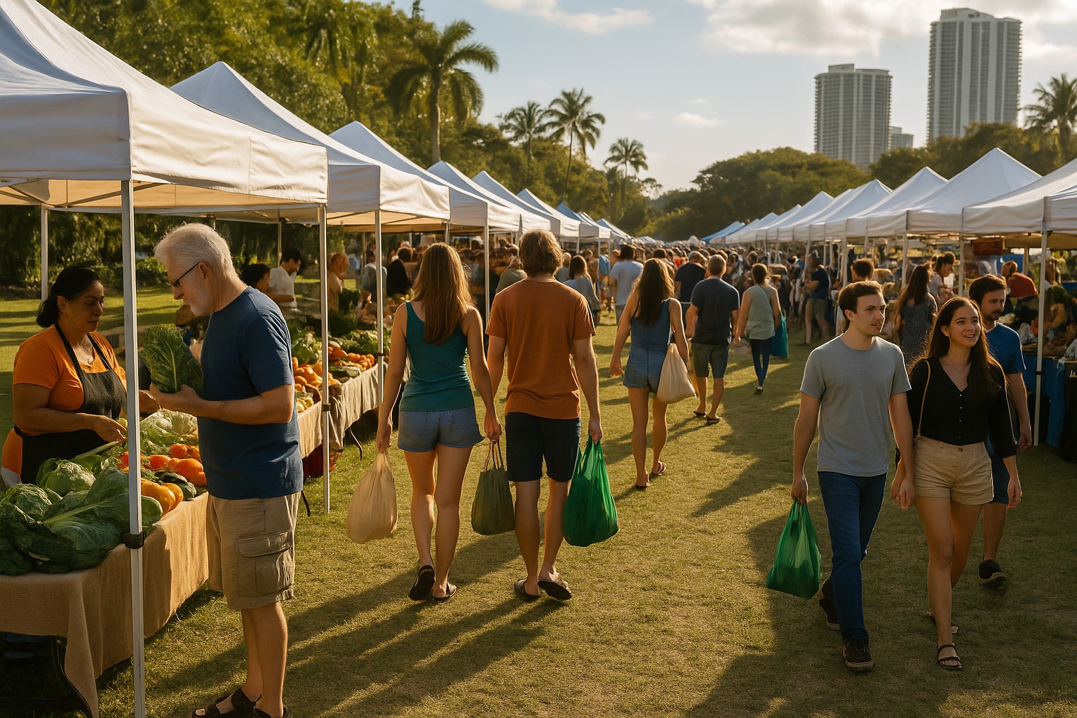 Em locais como o Vizcaya Village Farmers Market, todo domingo pela manhã no espaço da Vizcaya Museum & Gardens, o público encontra uma abundância de produtos cultivados por vizinhos da cidade, pães artesanais, itens de arte e design local – um cenário que mistura natureza, cultura e compras com graça e leveza. Já no Zoo Miami, a feira do primeiro e terceiro fim-de-semana do mês reúne produtores regionais no pórtico do zoológico, criando um ambiente ideal para um passeio em família, com brilho de feira matinal e charme de sábado. Em West Miami, no Cooper Park, o clima é de comunidade: a feira agitando cedo com sucos prensados frescos, pães, comida de food-truck e barracas de pequenos negócios que ganham visibilidade.