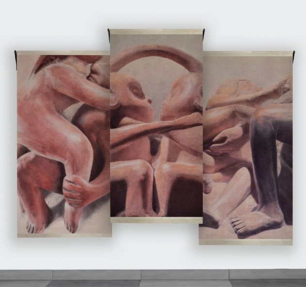 A primeira obra que chamou minha atenção foi “Vacilante”, colaboração entre Justin Favela e Miguel Arzabe. Os dois criaram um trabalho pintado em canvas que depois é recortado e tecido novamente, como um corpo que se reconstrói.