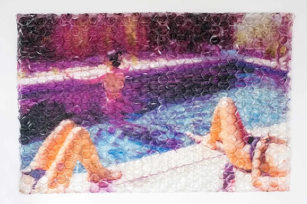 Entre as descobertas mais intrigantes, destaca-se a britânica Rosie Clements, que trabalha com fotografias do cotidiano — amigos, gestos íntimos, cenas diretas — impressas em imagem UV sobre plástico bolha, emolduradas com tampa de plexiglass transparente e fundo de canvas.