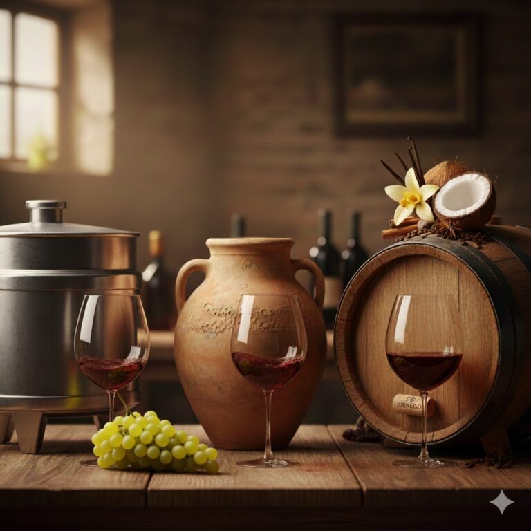 É nesse período que o produtor decide onde o vinho vai descansar. Já posso mencionar a importância desse processo, já que cada escolha transforma a personalidade do produto. Um mesmo líquido pode resultar em vinhos completamente diferentes dependendo do recipiente.
