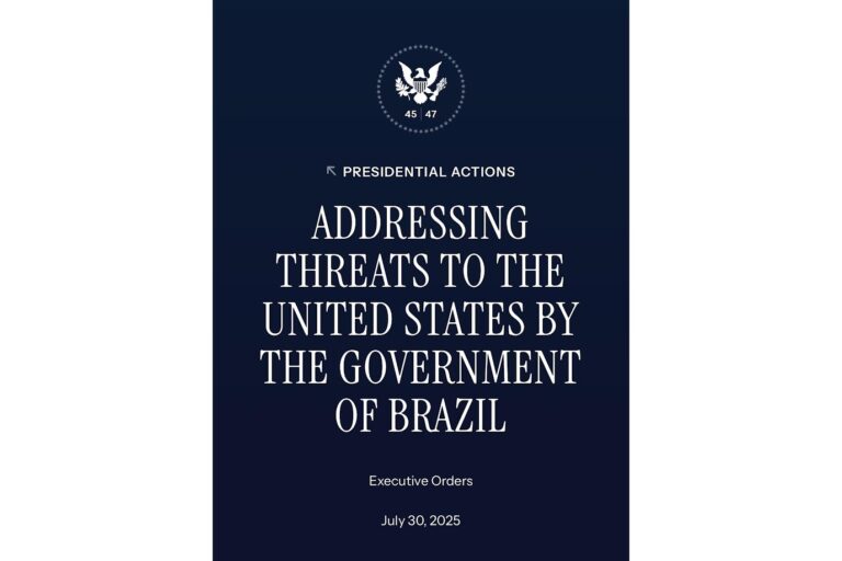 Washington, D.C. – Em 30 de julho de 2025, o Presidente Donald J. Trump assinou uma ordem executiva declarando emergência nacional e impondo uma tarifa adicional de 40 %, elevando a alíquota total sobre importações brasileiras para 50 %, com vigência a partir de 6 de agosto de 2025.